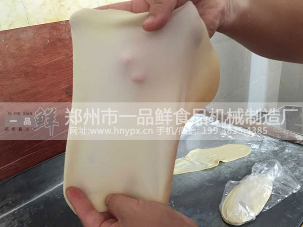 一品鮮燴面機生產(chǎn)出來的燴面坯,拉的薄的時候,就像紙一樣,能把面粉的面筋做出來。